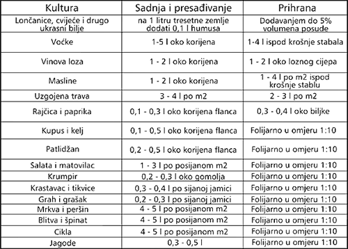 Za tekuće ili folijarno prihranjivanje rastopite humus u vodi u omjeru 1:10, ostavite nekoliko sati da odstoji i zatim zaljevajte ili prskajte biljke.